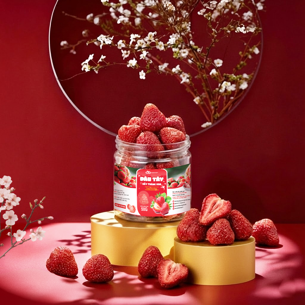 Dâu Tây Sấy Hủ Pet giữ trọn hương vị tươi ngọt, giòn xốp và giàu dinh dưỡng. 100% tự nhiên, không đường, không chất bảo quản, tiện lợi dùng trực tiếp, làm bánh, kem hay trang trí món uống. Lựa chọn lành mạnh, tiện lợi cho mọi gia đình.